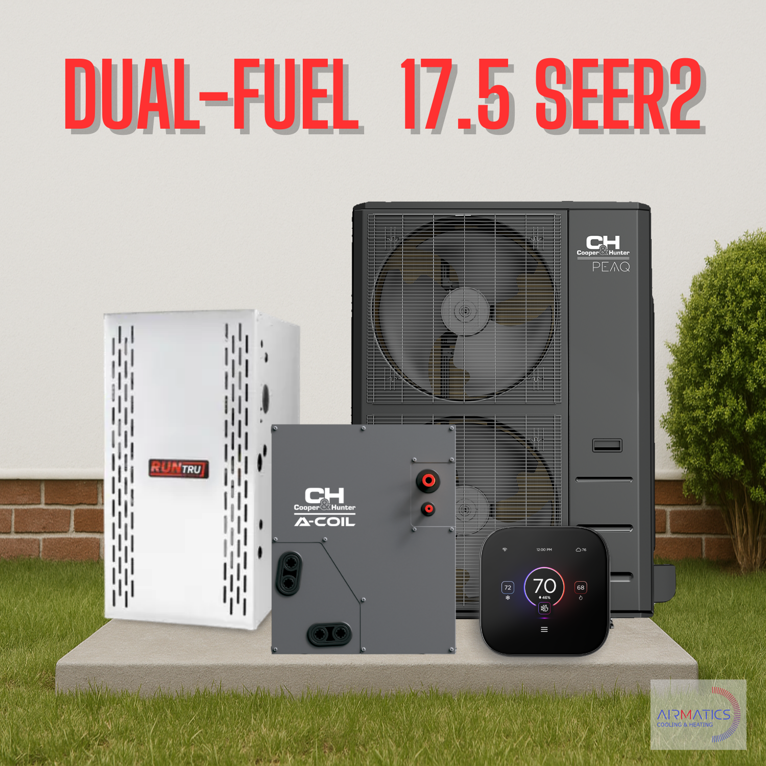 The dual-fuel HVAC system combines a high-efficiency Cooper & Hunter PEAQ heat pump with a durable evaporator coil, a dependable RunTru 80% AFUE furnace, and an advanced smart thermostat. The PEAQ heat pump delivers Energy Star performance, variable-speed comfort, and reliable heating down to –22°F, while the GoldFin-coated coil ensures quiet, efficient airflow. The RunTru gas furnace provides strong, consistent heat when outdoor temperatures drop, allowing the system to switch seamlessly between electric and gas heat for maximum efficiency, lower utility costs, and year-round comfort.